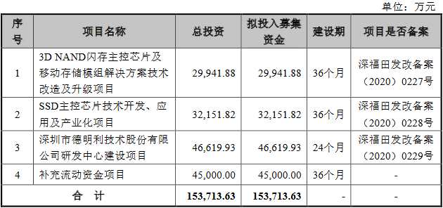 德明利本次公開(kāi)發(fā)行新股數(shù)量不超過(guò)2,000萬(wàn)股,占發(fā)行后總股本的比例不低于25%,擬募集資金153,713.63萬(wàn)元。