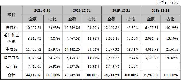 2018年末、2019年末、2020年末和2021年6月末,德明利存貨中,原材料賬面價(jià)值分別為6,479.34萬(wàn)元、12,460.82萬(wàn)元、10,759.86萬(wàn)元和10,557.74萬(wàn)元,占比分別為40.59%、43.35%、24.60%和23.93%;半成品賬面價(jià)值分別為4,088.98萬(wàn)元、5,579.32萬(wàn)元、14,442.26萬(wàn)元和11,455.52萬(wàn)元,占比分別為25.61%、19.41%、33.02%和25.97%;庫(kù)存商品賬面價(jià)值分別為3,303.28萬(wàn)元、5,588.27萬(wàn)元、6,435.57萬(wàn)元和10,728.94萬(wàn)元,占比分別為20.69%、19.44%、14.71%和24.32%;在產(chǎn)品賬面價(jià)值分別為0元、1,493.78萬(wàn)元、7,137.03萬(wàn)元和7,462.05萬(wàn)元,占比分別為0、5.20%、16.32%和16.91%。