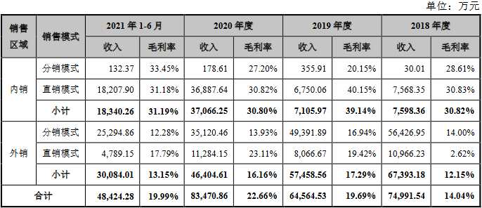 按產(chǎn)品銷售區(qū)域分類,過(guò)去三年及一期,該公司內(nèi)銷收入分別為7,598.36萬(wàn)元、7,105.97萬(wàn)元、37,066.25萬(wàn)元和18,340.26萬(wàn)元,占比分別為10.13%、11.01%、44.41%和37.87%;外銷收入分別為67,393.18萬(wàn)元、57,458.56萬(wàn)元、46,404.61萬(wàn)元和30,084.02萬(wàn)元,占比分別為89.87%、88.99%、55.59%和62.13%。