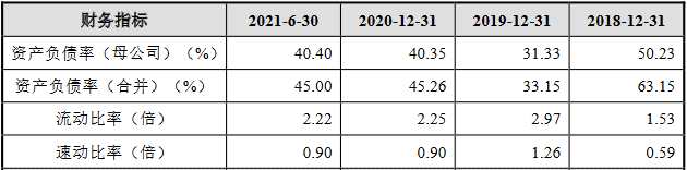 2018年、2019年、2020年和2021年1-6月,德明利資產(chǎn)負(fù)債率(合并)分別為63.15%、33.15%、45.26%和45.00%,流動(dòng)比率分別為1.53倍、2.97倍、2.25倍和2.22倍,速動(dòng)比率分別為0.59倍、1.26倍、0.90倍和0.90倍。