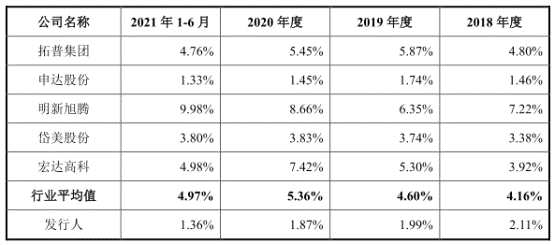 報(bào)告期內(nèi),公司研發(fā)費(fèi)用率呈下降趨勢(shì),分別為2.11%、1.99%、1.87%和1.36%,同行業(yè)可比公司研發(fā)費(fèi)用率均值分別為4.16%、4.60%、5.36%、4.97%。
