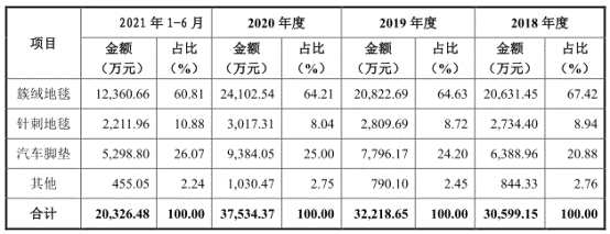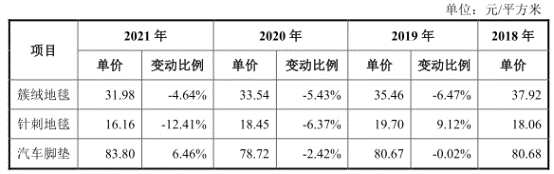 2018年至2021年6月30日,公司簇絨地毯銷售收入分別為20,631.45萬(wàn)元、20,822.69萬(wàn)元、24,102.54萬(wàn)元、12,360.66萬(wàn)元,占主營(yíng)業(yè)務(wù)收入的比例分別為67.42%、64.63%、64.21%、60.81%。簇絨地毯銷售價(jià)格連降,分別為37.92元/平方米、35.46元/平方米、33.54元/平方米、31.98元/平方米。
