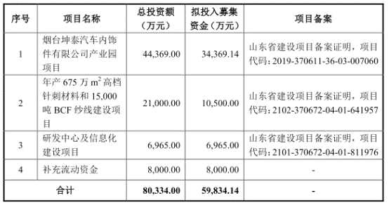 公司擬募集資金59,834.14萬(wàn)元,其中34,369.14萬(wàn)元用于煙臺(tái)坤泰汽車內(nèi)飾件有限公司產(chǎn)業(yè)園項(xiàng)目、10,500.00萬(wàn)元用于年產(chǎn)675萬(wàn)m2高檔針刺材料和15,000噸BCF紗線建設(shè)項(xiàng)目、6,965.00萬(wàn)元用于研發(fā)中心及信息化建設(shè)項(xiàng)目、8,000.00萬(wàn)元用于補(bǔ)充流動(dòng)資金。
