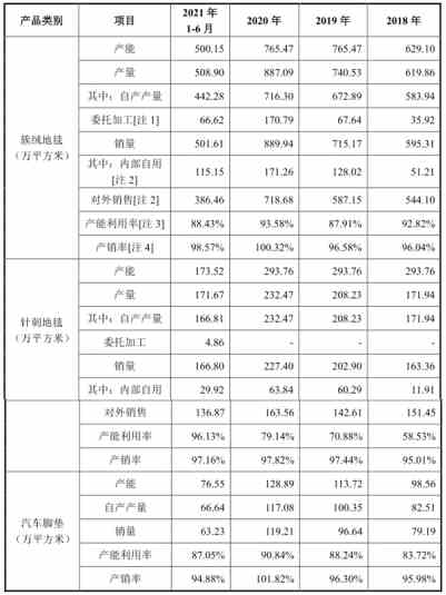 2018年至2021年6月30日,坤泰股份簇絨地毯產(chǎn)能利用率分別為92.82%、87.91%、93.58%、88.43%;產(chǎn)銷率分別為96.04%、96.58%、100.32%、98.57%。