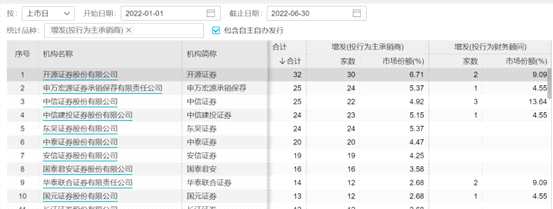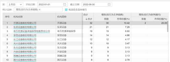 下圖為2022年上半年A股券商投行在增發(fā)方面的市場份額排名(按照擔(dān)任主承銷商和財務(wù)顧問之和的家數(shù)排序)。可以看出,開源證券一騎絕塵,排名第一,申萬宏源承銷保薦排名第二,中信證券、中信建投分列第三和第四。