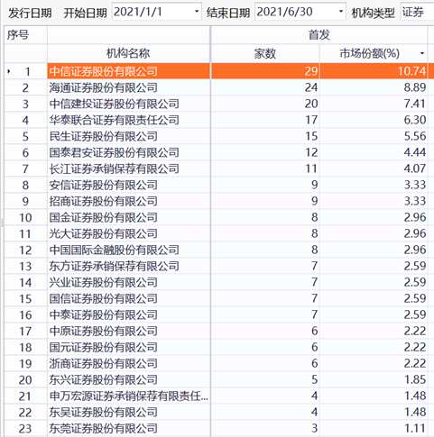 下圖則為2021年上半年IPO市場份額(按照上市家數(shù)排序)。2021年上半年共有49家券商在IPO領(lǐng)域有所收獲。其中,中信證券保薦了29家公司,市場份額達(dá)到10.74%。當(dāng)時的次名為海通證券,共計保薦了24家,市場份額為8.89%。