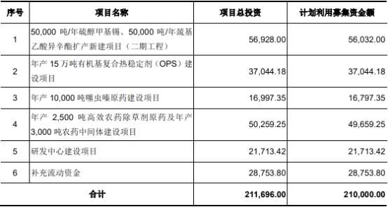 犇星新材擬在上交所主板發(fā)行不超過發(fā)行股數(shù)不超過6360萬股,且不低于本次發(fā)行后總股本的15%。公司擬募集資金21.00億元,分別用于50000噸/年硫醇甲基錫、50000噸/年巰基乙酸異辛酯擴(kuò)產(chǎn)新建項(xiàng)目(二期工程)、年產(chǎn)15萬噸有機(jī)基復(fù)合熱穩(wěn)定劑(OPS)建設(shè)項(xiàng)目、年產(chǎn)10000噸噻蟲嗪原藥建設(shè)項(xiàng)目、年產(chǎn)2500噸高效農(nóng)藥除草劑原藥及年產(chǎn)3000噸農(nóng)藥中間體建設(shè)項(xiàng)目、研發(fā)中心建設(shè)項(xiàng)目、補(bǔ)充流動(dòng)資金。