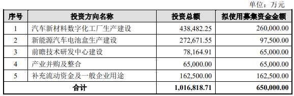 敏實集團原擬在上交所科創(chuàng)板募資65億元,擬用于“汽車新材料數字化工廠生產建設”、“新能源汽車電池盒生產建設”、“前瞻技術研發(fā)中心建設”、“產業(yè)并購及整合”、“補充流動資金及一般企業(yè)用途”。