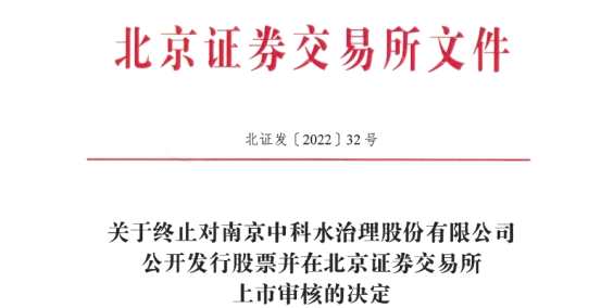 摘要: 北交所網(wǎng)站近日披露的消息顯示,北交所決定終止對南京中科水治理股份有限公司(以下簡稱“水治理”)公開發(fā)行股票并在北京證券交易所上市審核。2022年7月18日,水治理向北交所提交了《南京中科水治理股份有限