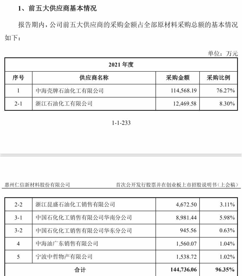 仁信新材上游采購產(chǎn)品苯乙烯跟國際油價聯(lián)動,受到俄烏沖突影響國際油價大漲,可能對仁信新材偏低的毛利率造成進一步壓力;另一方面,仁信新材供應商中海殼牌的苯乙烯采購占全部苯乙烯采購的比例甚至達到76.27%。