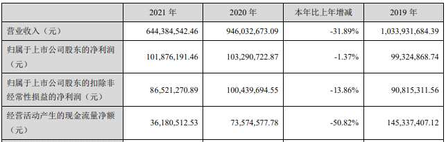 上市前,公司營收已經(jīng)出現(xiàn)下降。2018年、2019年、2020年,華融化學的營業(yè)收入分別為96,631.59萬元、103,393.17萬元、94,603.27萬元;歸屬于母公司所有者的凈利潤7447.32萬元、9932.49萬元、10,329.07萬元;扣除非經(jīng)常性損益后歸屬于母公司所有者的凈利潤分別為5048.49萬元、9081.53萬元、10,043.97萬元;經(jīng)營活動產(chǎn)生的現(xiàn)金流量凈額分別為12,358.43萬元、14,533.74萬元、7357.46萬元。