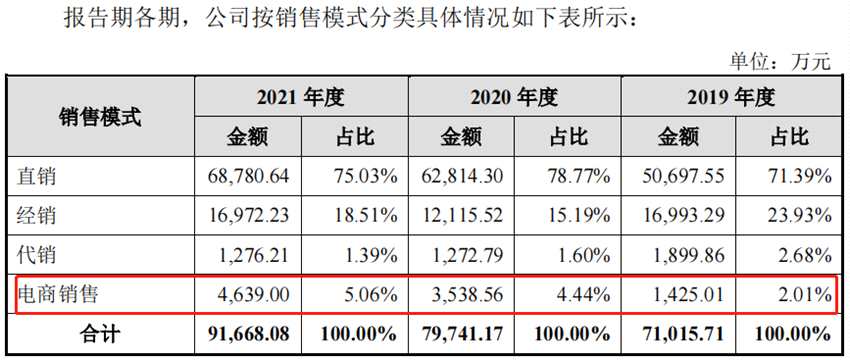 其中,線上電商模式的收入雖逐年增加,但仍占比較小。報告期內(nèi),公司電商銷售收入分別為1425.01萬元、3538.56萬元和4639.00萬元,占主營業(yè)務(wù)收入的比例分別為2.01%、4.44%和5.06%。