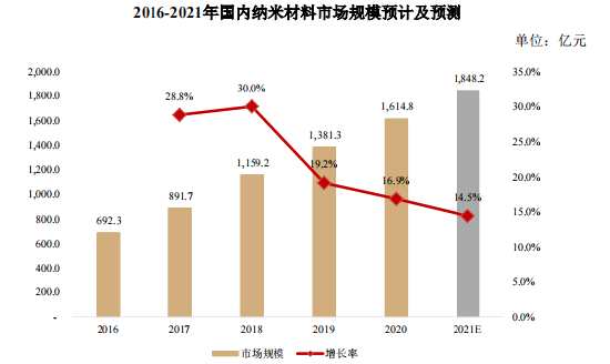近年來,我國納米材料市場規(guī)模持續(xù)增長,但增速逐年放緩。根據(jù)中商產(chǎn)業(yè)研究院數(shù)據(jù),2018-2020年,國內(nèi)納米材料市場規(guī)模分別為30%、19.2%和16.9%,預(yù)計(jì)2021年增速將降至14.5%。