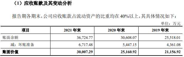 2018年末-2021年末,工大科雅應(yīng)收賬款賬面余額分別為20,368.32萬元、25,518.01萬元、30,608.07萬元、36,724.77萬元,應(yīng)收賬款賬面價值分別為17,697.64萬元、21,156.92萬元、25,160.92萬元和30,007.29萬元,占當(dāng)期營業(yè)收入的比例分別為63.26%、69.53%、81.80%和74.40%。