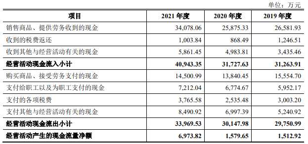 2018年-2021年,工大科雅營業(yè)收入分別為27,976.89萬元、30,428.63萬元、30,758.12萬元、40,333.89萬元,凈利潤分別為5,857.66萬元、6,303.40萬元、6,160.40萬元、8,606.18萬元,經(jīng)營活動產(chǎn)生的現(xiàn)金流量凈額分別為320.01萬元、1,512.92萬元、1,579.65萬元、6,973.82萬元,凈現(xiàn)比分別為0.05、0.24、0.26、0.81。