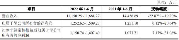2022年上半年,公司預(yù)計實現(xiàn)營業(yè)收入11,150.25萬元-11,681.22萬元,變動幅度為-22.87%至-19.20%;歸屬于母公司所有者的凈利潤為1,252.62萬元-1,509.27萬元,變動幅度為0.12%至20.64%。