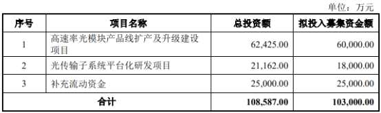 德科立2022年8月4日披露的招股書顯示,公司擬募集資金103,000.00萬元,計劃用于高速率光模塊產(chǎn)品線擴(kuò)產(chǎn)及升級建設(shè)項目、光傳輸子系統(tǒng)平臺化研發(fā)項目、補(bǔ)充流動資金。