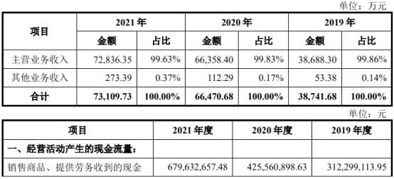 2019年至2021年,德科立主營業(yè)務(wù)收入分別為38,688.30萬元、66,358.40萬元、72,836.35萬元,銷售商品、提供勞務(wù)收到的現(xiàn)金分別為31,229.91萬元、42,556.09萬元、67,963.27萬元。