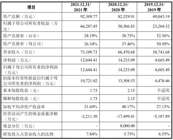 2019年至2021年,德科立營業(yè)收入分別為38,741.68萬元、66,470.68萬元、73,109.73萬元,凈利潤分別為4,665.49萬元、14,233.09萬元、12,644.41萬元,歸屬于母公司所有者的凈利潤分別為4,665.49萬元、14,233.09萬元、12,644.41萬元,扣除非經(jīng)常性損益后歸屬于母公司所有者的凈利潤4,476.46萬元、13,508.53萬元、10,721.02萬元。