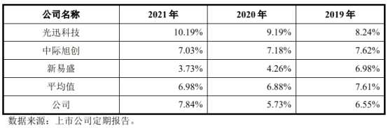 2019年至2021年,德科立研發(fā)投入分別為2,538.11萬元、3,808.17萬元、5,735.09萬元,占營業(yè)收入比例分別為6.55%、5.73%、7.84%;同期可比公司研發(fā)費(fèi)用率均值分別為7.61%、6.88%、6.98%。