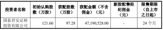 保薦機(jī)構(gòu)國泰君安證券股份有限公司安排依法設(shè)立的全資子公司國泰君安證裕投資有限公司參與本次發(fā)行戰(zhàn)略配售,國泰君安證裕投資有限公司依據(jù)《上海證券交易所科創(chuàng)板發(fā)行與承銷規(guī)則適用指引第1號——首次公開發(fā)行股票》第十八條規(guī)定確定本次跟投的股份數(shù)量為97.28萬股,占本次發(fā)行總量的4.00%,跟投金額為47,190,528.00元。