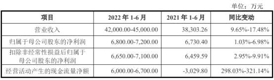 2022年1-6月,德科立預(yù)計營業(yè)收入為42,000.00萬元至45,000.00萬元,同比變動9.65%至17.48%;歸屬于母公司股東的凈利潤為6,800.00萬元至7,200.00萬元,同比變動1.03%至6.98%;扣除非經(jīng)常性損益后歸屬于母公司股東的凈利潤為6,650.00萬元至7,100.00萬元,同比變動2.95%至9.91%;經(jīng)營活動產(chǎn)生的現(xiàn)金流量凈額為6,000.00萬元至6,700.00萬元,同比變動298.03%至321.14%。