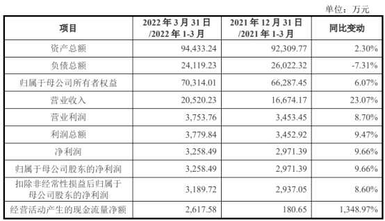 2022年1-3月,德科立營業(yè)收入為20,520.23萬元,同比增長23.07%;凈利潤為3,258.49萬元,同比增長9.66%;歸屬于母公司股東的凈利潤為3,258.49萬元,同比增長9.66%;扣除非經(jīng)常性損益后歸屬于母公司股東的凈利潤為3,189.72萬元,同比增長8.60%;經(jīng)營活動產(chǎn)生的現(xiàn)金流量凈額為2,617.58萬元,同比增加1,348.97%。