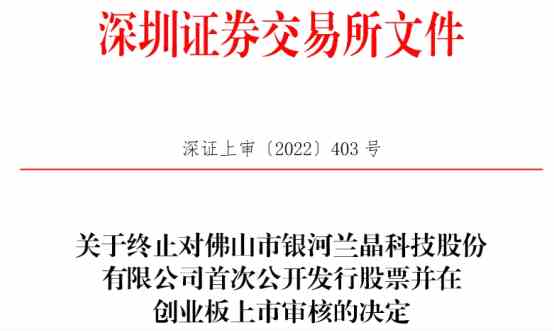 2022年8月5日,銀河股份向深交所提交了《佛山市銀河蘭晶科技股份有限公司關(guān)于撤回首次公開(kāi)發(fā)行股票并在創(chuàng)業(yè)板上市的申請(qǐng)》,保薦人向深交所提交了《長(zhǎng)江證券承銷保薦有限公司關(guān)于撤回佛山市銀河蘭晶科技股份有限公司首次公開(kāi)發(fā)行股票并在創(chuàng)業(yè)板上市申請(qǐng)文件的申請(qǐng)》。根據(jù)《深圳證券交易所創(chuàng)業(yè)板股票發(fā)行上市審核規(guī)則》第六十七條的有關(guān)規(guī)定,深交所決定終止對(duì)銀河股份首次公開(kāi)發(fā)行股票并在創(chuàng)業(yè)板上市的審核。