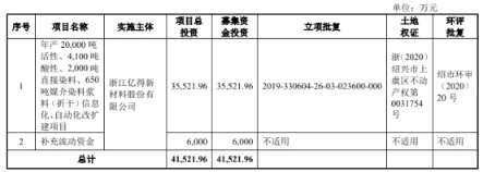 浙江億得原擬在深交所創(chuàng)業(yè)板上市,公司首次公開發(fā)行人民幣普通股A股股票總數(shù)不超過1941.54萬股,全部為公開發(fā)行新股,不安排公司股東公開發(fā)售股份。公司公開發(fā)行新股數(shù)量不低于本次發(fā)行后總股本的25%。浙江億得原擬募集資金4.15億元,計劃分別用于年產(chǎn)20000噸活性、4100噸酸性、2000噸直接染料、650噸媒介染料漿料(折干)信息化、自動化改擴建項目;補充流動資金。