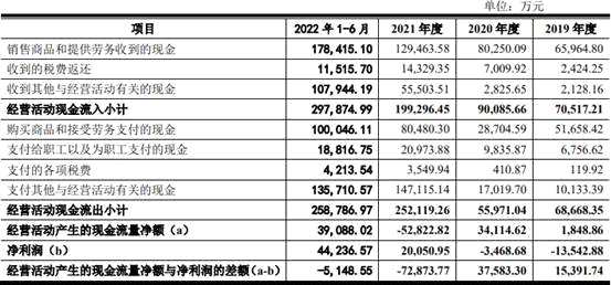 2019年至2022年1-6月,美科股份銷售商品和提供勞務(wù)收到的現(xiàn)金分別為65,964.80萬元、80,250.09萬元、129,463.58萬元、178,415.10萬元;經(jīng)營活動產(chǎn)生的現(xiàn)金流量凈額分別為1,848.86萬元、34,114.62萬元、-52,822.82萬元、39,088.02萬元。