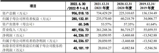 2019年、2020年、2021年、2022年1-6月,美科股份的營業(yè)收入分別為55,059.55萬元、86,719.27萬元、361,248.36萬元、481,926.73萬元;歸屬于母公司所有者的凈利潤分別為-13,542.88萬元、-3,468.68萬元、20,050.95萬元、44,236.57萬元;扣除非經(jīng)常性損益后歸屬于母公司股東的凈利潤分別為-5,546.56萬元、-6,082.84萬元、20,016.27萬元、43,181.19萬元。
