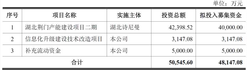 詩尼曼原擬在深交所創(chuàng)業(yè)板公開發(fā)行新股不超過2,420萬股,占公司發(fā)行后總股本的比例不低于25%。公司原擬募集資金48,147.08萬元,用于湖北荊門產(chǎn)能建設(shè)項目二期、信息化升級建設(shè)技術(shù)改造項目、補充流動資金。