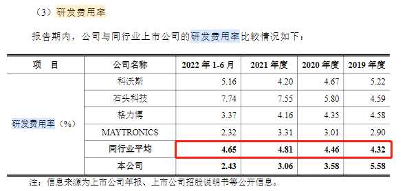 而望圓科技的研發(fā)投入不高,研發(fā)費用率也低于行業(yè)平均水平。報告期各期,公司研發(fā)費用分別為324.19萬元、468.93萬元、888.74萬元和739.54萬元,研發(fā)費用率分別為5.58%、3.58%、3.06%和2.43%,持續(xù)下滑。與此同時,同行業(yè)公司研發(fā)費用率的平均值分別為4.32%、4.46%、4.81%和4.65%。