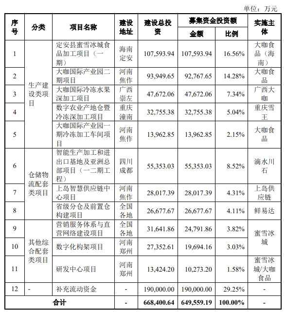 蜜雪冰城擬募集資金649,559.19萬元,用于生產(chǎn)建設(shè)類項(xiàng)目、倉儲(chǔ)物流配套類項(xiàng)目、其他綜合配套類項(xiàng)目、補(bǔ)充流動(dòng)資金。
