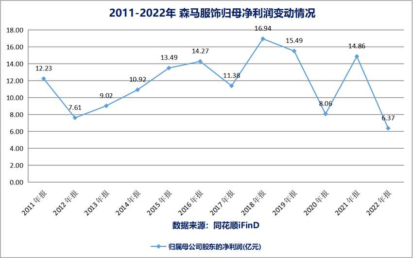 從2021年的利潤水平來看,森馬服飾裁員的舉動或已奏效,公司當期實現(xiàn)歸母凈利潤14.86億元。但到2022年,森馬服飾歸母凈利潤創(chuàng)上市12年以來歷史新低,公司當期歸母凈利潤為6.37億元。
