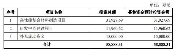 晉飛碳纖本次原擬發(fā)行的股票數(shù)量為2916.0594萬股,不低于發(fā)行后總股本的25%。本次發(fā)行全部為新股發(fā)行,原股東不公開發(fā)售股份,最終發(fā)行數(shù)量經(jīng)中國(guó)證監(jiān)會(huì)注冊(cè)后確定。晉飛碳纖擬募集資金5.89億元,用于高性能復(fù)合材料制造項(xiàng)目、研發(fā)中心建設(shè)項(xiàng)目、補(bǔ)充流動(dòng)資金項(xiàng)目。