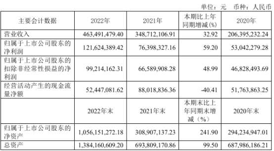 景業(yè)智能2022年?duì)I業(yè)收入為4.63億元,同比增長32.92%;歸屬于上市公司股東的凈利潤為1.22億元,同比增長59.20%;歸屬于上市公司股東的扣除非經(jīng)常性損益的凈利潤為9921.42萬元,同比增長48.99%;經(jīng)營活動(dòng)產(chǎn)生的現(xiàn)金流量凈額為5244.71萬元,同比減少40.41%。