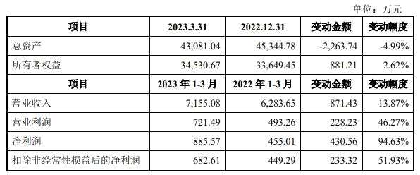 2023年1-3月公司的營(yíng)業(yè)收入為7,155.08萬(wàn)元,較2022年1-3月增加了871.43萬(wàn)元,同比增長(zhǎng)13.87%,實(shí)現(xiàn)扣除非經(jīng)常性損益后的凈利潤(rùn)682.61萬(wàn)元,較2022年1-3月增加了233.32萬(wàn)元,增長(zhǎng)幅度為51.93%。營(yíng)業(yè)收入、營(yíng)業(yè)利潤(rùn)、凈利潤(rùn)與扣除非經(jīng)常性損益后的凈利潤(rùn)同比增長(zhǎng)。