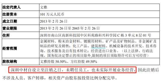 另?yè)?jù)公開(kāi)資料顯示,“深圳市歐萊中材科技有限公司”為方紅、文雅共同控制的公司,該公司已于2019年3月注銷(xiāo),截止到2017年年報(bào)信息其社保繳納人為20人,由此也可以看出“深圳市歐萊中材科技有限公司”的經(jīng)營(yíng)體量并不小。但與此同時(shí),歐萊新材發(fā)布的《發(fā)行人及保薦機(jī)構(gòu)回復(fù)意見(jiàn)》第465頁(yè)卻披露到:“深圳中材自設(shè)立至注銷(xiāo)之日,未聘任員工,也未實(shí)際開(kāi)展業(yè)務(wù)經(jīng)營(yíng)”。