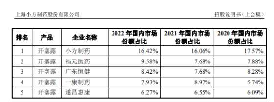 而對比此前的公告發(fā)現(xiàn),近年來,小方制藥主要產(chǎn)品“信龍”牌開塞露市場占有率已經(jīng)大幅下降。公司此次發(fā)布的招股說明書顯示,2020年小方制藥開塞露國內(nèi)市場占有率17.57%、2022年為16.42%。對此小方制藥招股書稱,公司產(chǎn)品已具備較強(qiáng)的競爭力和較高的市場認(rèn)可度,但開塞露市占率從2017年的48%下降到2022年的16.42%,與前述遠(yuǎn)大醫(yī)藥公告披露并不相符。