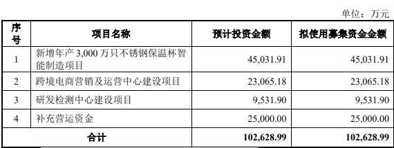 同富股份原擬在上交所主板發(fā)行不超過3,402萬股,原擬募集資金102,628.99萬元,計劃用于新增年產(chǎn) 3,000 萬只不銹鋼保溫杯智能制造項目、跨境電商營銷及運(yùn)營中心建設(shè)項目、研發(fā)檢測中心建設(shè)項目、補(bǔ)充營運(yùn)資金。