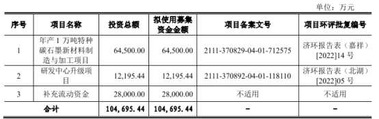 益大新材原擬在深交所創(chuàng)業(yè)板公開發(fā)行股票數(shù)量不超過7,375.9051萬股,占發(fā)行后公司總股本的比例不低于25%;原擬募集資金104,695.44萬元,計劃用于年產(chǎn)1萬噸特種碳石墨新材料制造與加工項目、研發(fā)中心升級項目、補(bǔ)充流動資金。