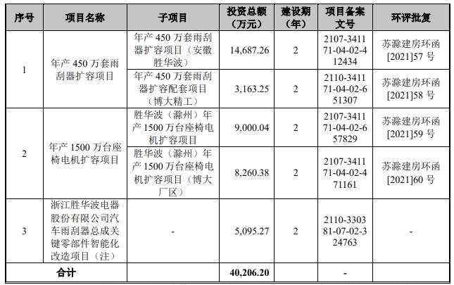 勝華波原擬發(fā)行股票數(shù)量不超過4,080.00萬股,不低于發(fā)行后總股本的10%;本次發(fā)行不涉及老股轉(zhuǎn)讓。勝華波原擬募集資金40,206.20萬元,分別用于年產(chǎn)450萬套雨刮器擴(kuò)容項目、年產(chǎn)1500萬臺座椅電機(jī)擴(kuò)容項目、浙江勝華波電器股份有限公司汽車雨刮器總成關(guān)鍵零部件智能化改造項目。