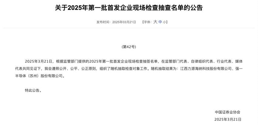 3月21日,中國證券業(yè)協(xié)會(huì)官網(wǎng)發(fā)布《關(guān)于2025年第一批首發(fā)企業(yè)現(xiàn)場檢查抽查名單的公告》,隨機(jī)抽取結(jié)果顯示,江西力源海納科技股份有限公司(簡稱“力源海納”)、強(qiáng)一半導(dǎo)體(蘇州)股份有限公司(簡稱“強(qiáng)一股份”)被抽中現(xiàn)場檢查。