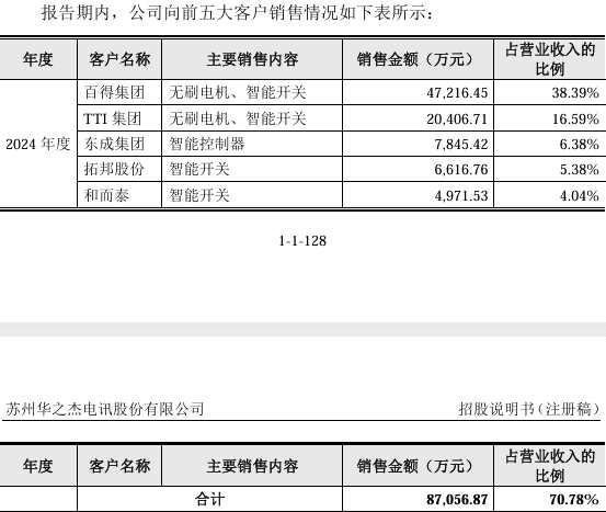2024年,華之杰收入對前五大客戶的依賴進(jìn)一步加劇。百得集團(tuán)、TTI集團(tuán)、東成集團(tuán)、拓邦股份和和而泰合計貢獻(xiàn)的收入為8.71億元,占比70.78%,而2022年和2023年的這一數(shù)字分別為67.32%和68.55%。