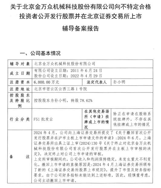 北京金萬(wàn)眾機(jī)械擬北交所IPO 一年前從滬市主板撤單