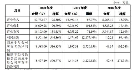 報告期內(nèi),公司營業(yè)收入分別為 8,768.10 萬元、16,490.14 萬元和 32,732.27 萬元。2018 年至 2020 年營業(yè)收入復合增長率為 93.21%;實現(xiàn)歸屬于母公司所有 者凈利潤分別為 49.37 萬元、1,392.31 萬元和 8,588.09 萬元,扣除非經(jīng)常性損益 后歸屬于母公司所有者的凈利潤分別為 42.48 萬元、1,414.38 萬元和 8,497.19 萬 元。