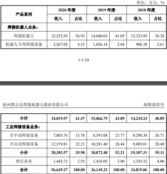 報(bào)告期內(nèi),公司焊接機(jī)器人業(yè)務(wù)收入占主營(yíng)業(yè)務(wù)收入的比例分別為 40.89%、43.89%以及 61.47%,收入占比持續(xù)提升,焊接機(jī)器人業(yè)務(wù)已成為公司未來(lái)重的發(fā)展方向。工業(yè)焊接設(shè)備收入占公司主營(yíng)業(yè)務(wù)收入的比例分別為 55.11%、52.21%以及 35.98%,工業(yè)焊接設(shè)備業(yè)務(wù)板塊依然為公司重要業(yè)務(wù)板塊之一。