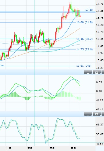 目前銀價的初步阻力位于17.32以及17.64美元,進一步阻力在17.80、18、18.45、18.60、18.80以及19美元。下行方面,初步支撐在16.90美元,進一步支撐在16.60、16.40、16.20、16以及15.87美元。