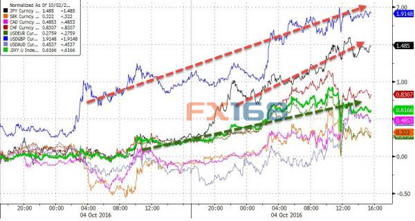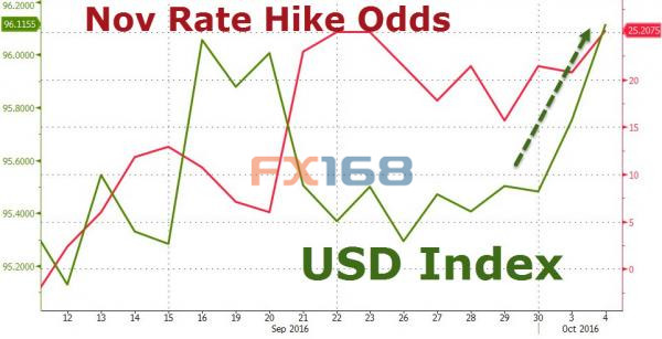 美國周一(10月3日)公布的ISM制造業(yè)數(shù)據(jù)強于預(yù)期,加之周二里奇蒙德聯(lián)儲主席萊克(Jeffrey Lacker)發(fā)表鷹派言論,這令美聯(lián)儲(FED)的加息預(yù)期大幅攀升,從而推高美元。